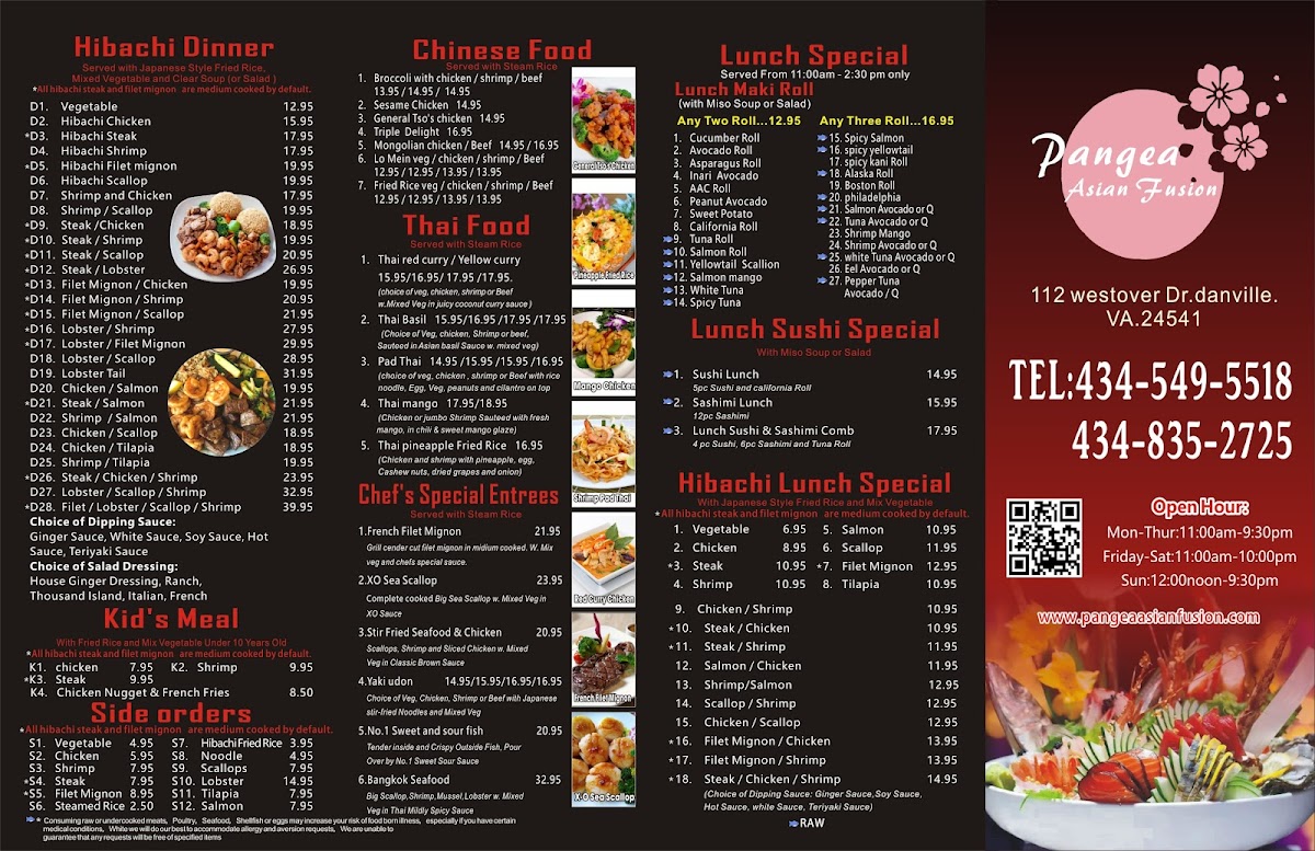 The menu at Pangea Asian Fusion offers a balanced blend of Asian flavors presented in a relaxed, approachable style. It features a mixture of casual bites and heartier dishes that make it suitable for a variety of mealtime moments—whether you're popping in for a satisfying lunch or settling down for a leisurely dinner with friends or family.